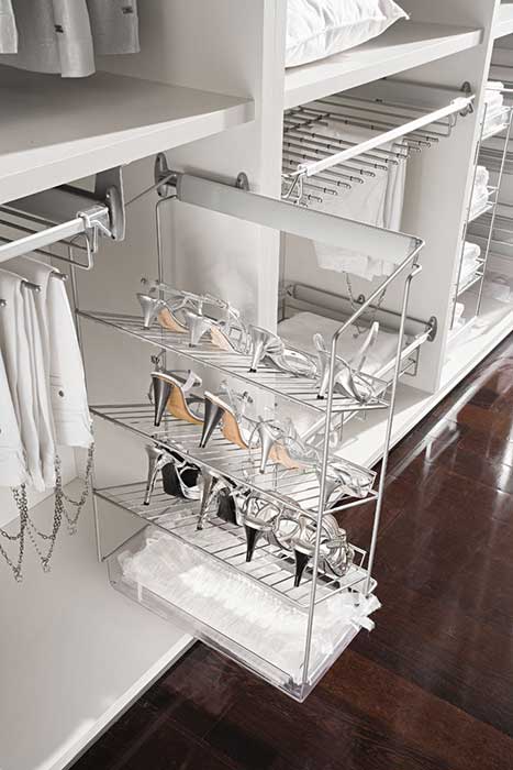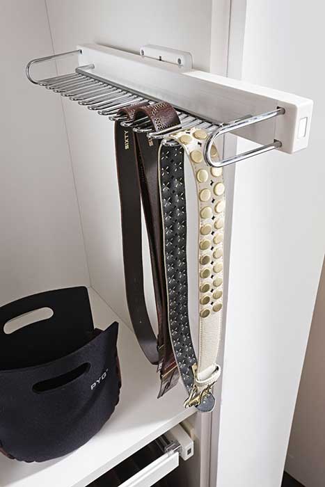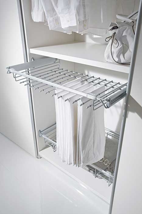 Our interior accessories include soft closing interior drawers with or without divisions and soft closing wire work pull outs in a variety of sizes. Jewellery drawers, fixed shoe rails, tie rails and a vast array of interior shelving makes up other storage options you can make use of in your home. Our innovative and ingenious hanging rails can also help you save crucial space in your home.